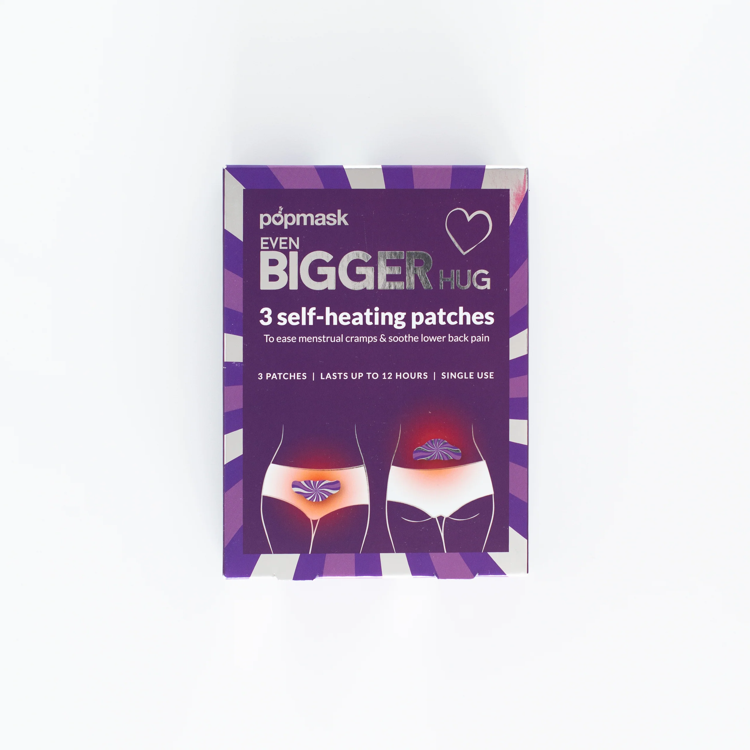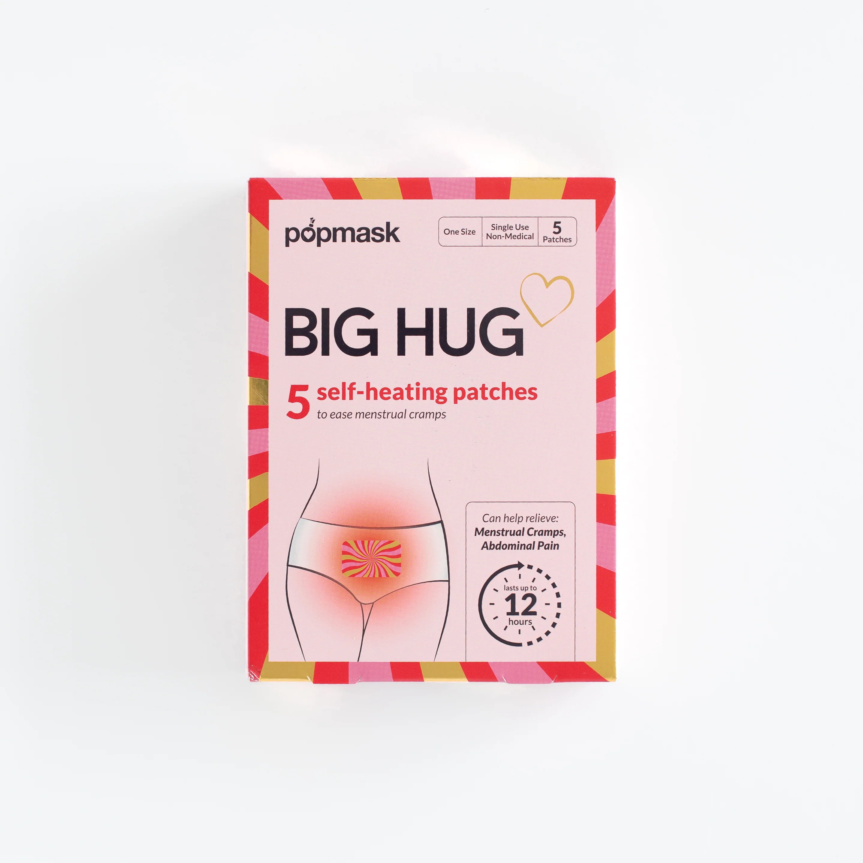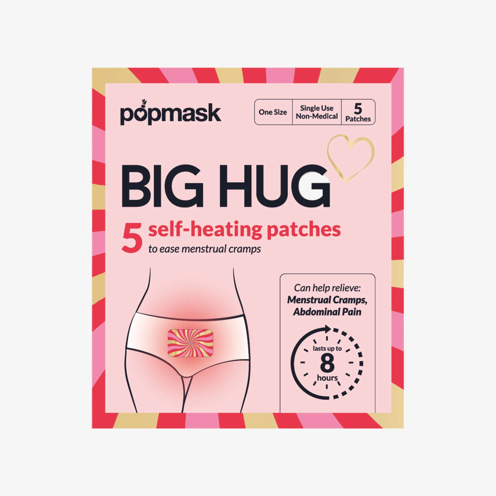 Big Hug Pop Undies are Popmask's period underwear specifically designed to work seamlessly with their heating patches. These underwear likely feature strategic placement areas or adhesive-friendly materials that keep heating patches secure throughout the day.
